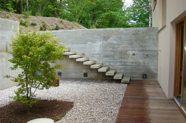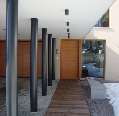 Celotna vhodna etaža je vkopana, z atrijem pred prostori za sprostitev in rekreacijo se odpira v naravo. S tem je zagotavljena osvetlitev vkopanih bivalnih prostorov.