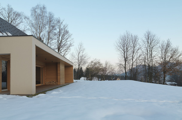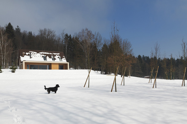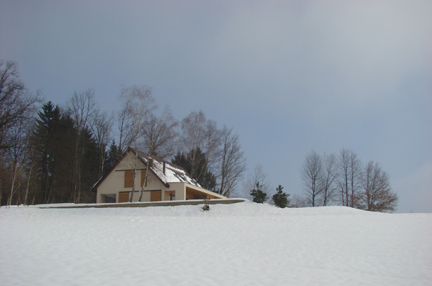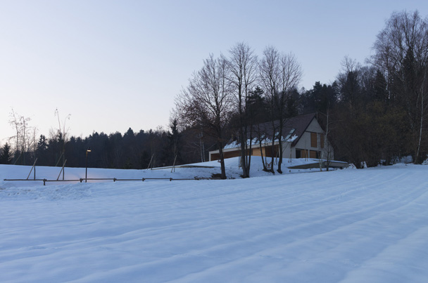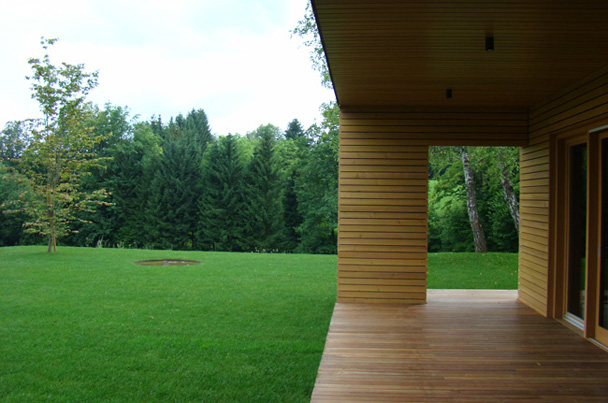 Hiša je zgrajena v idiličnem naravnem okolju na robu gozda. Objekt se, kljub relativno veliki uporabni površini, zlije z okolico, v prostoru deluje sorazmerno majhen, kot pritlična hiša z mansardo pod klasično dvokapno streho. Koncept zasnove temelji na ideji, da so bivalni prostori neposredno povezani z naravo, z velikimi panoramskimi okni se odpirajo na nadkrite terase v nivoju raščenega terena. Veliko pozornosti smo namenili iskanju lepih pogledov in spuščanju svetlobe v prostor.