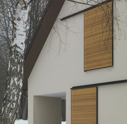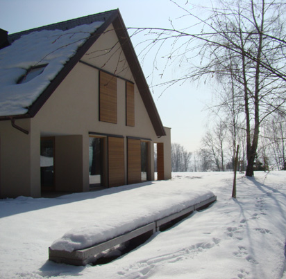 Hiša je klasično grajena z opeko, toplotno je izolirana v nizko energetskem standardu. Fasada je ometana, v posameznih delih je obložena z masivnim lesom - macesnom.